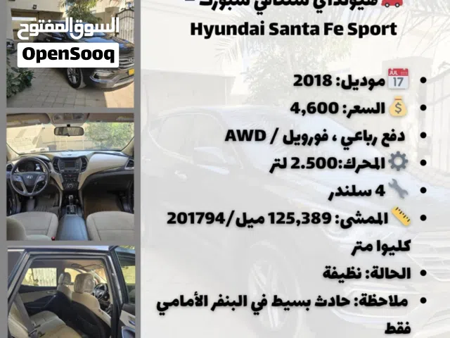 مستعمل , هيونداي , سنتافي , Sport 2.0t , 2018 , 80,000 - 89,999 كم , هاتشباك , 6 , بنزين , اوتوماتيك , 2,000 - 2,999 سي سي , أبيض , رمادي , مواصفات أمريكية , مرخصة , تأمين شامل , ممتازة بدون حوادث , أعيد دهانها جزئياً