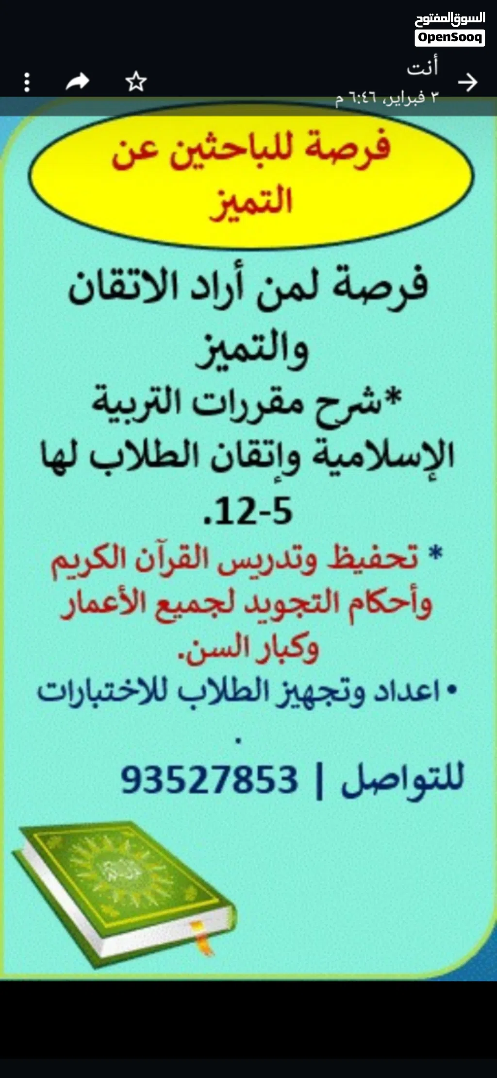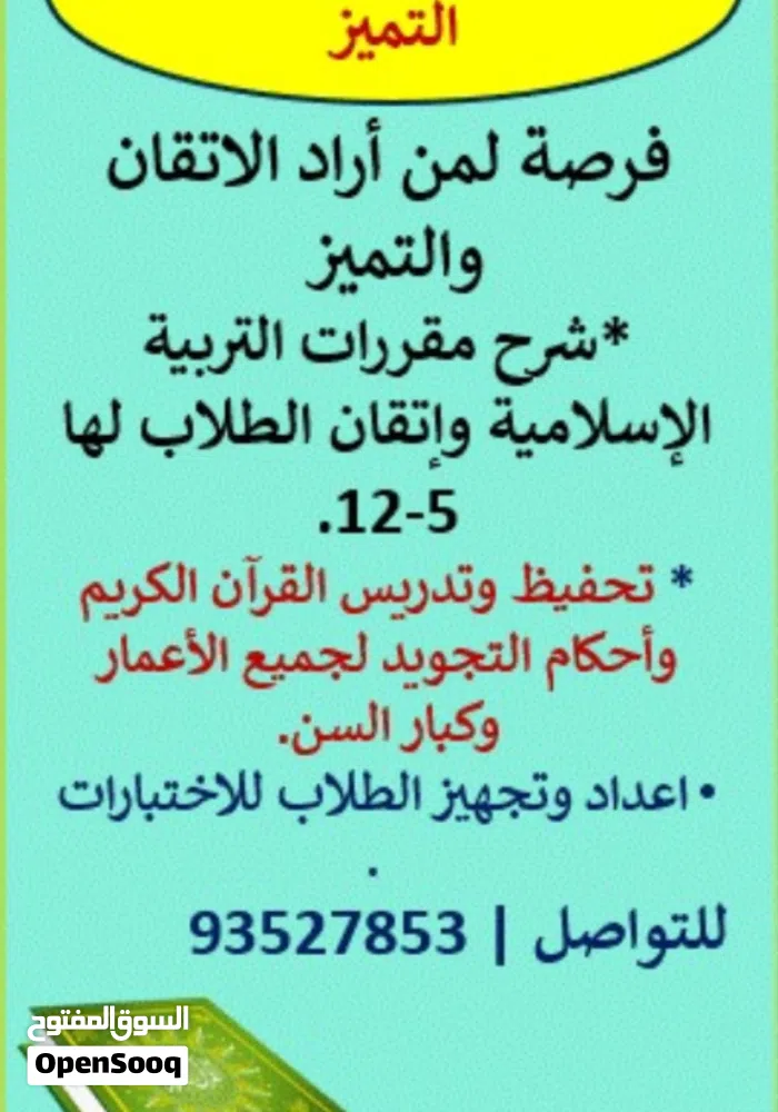 معلم خبرة في التعليم والتدريس خبرة في سلطنة عمان 9 سنوات وخارج السلطنة أكثر من 10 سنوات خبرة غي إعداد وتأسيس الطلاب للاختبارات في الإسلامية وتعليم القرآن وأحكام التجويد والميراث